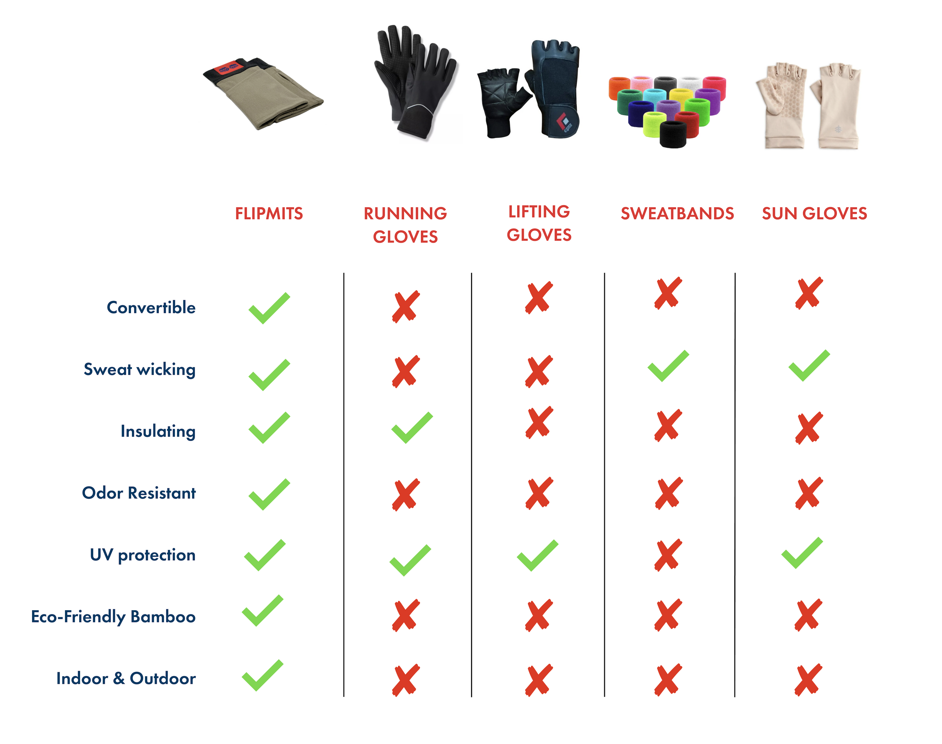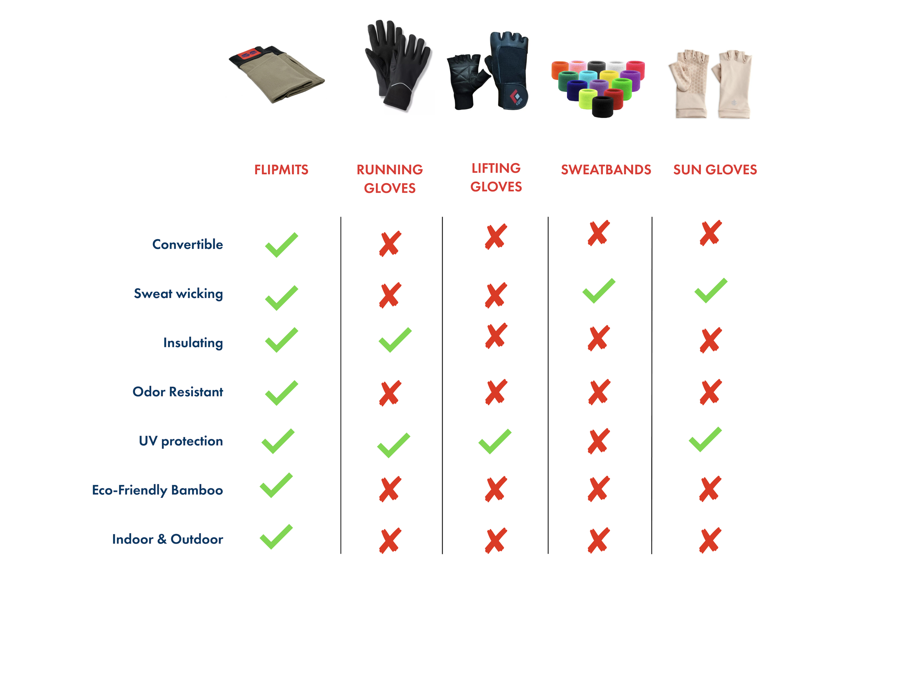 FLIPMITS simplifies your workout and activities with ultimate sweat protection and comfort. 50% more absorbent than sweatbands and more comfortable than traditional gloves. Protect your hands and protect the environment with this long-lasting handwear.